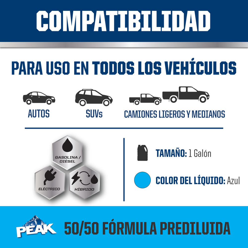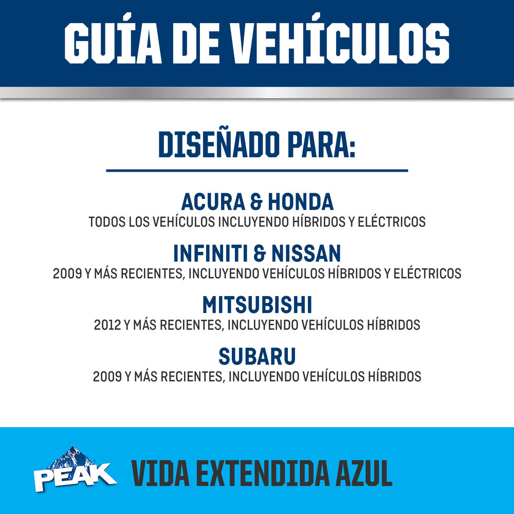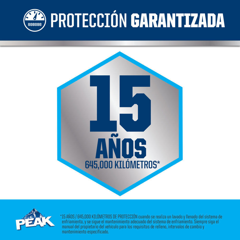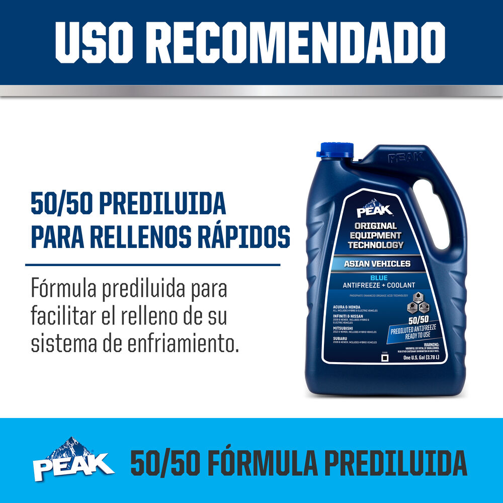 El ANTICONGELANTE + REFRIGERANTE PREDILUIDO 50/50 PEAK ORIGINAL EQUIPMENT TECHNOLOGY para VEHÍCULOS ASIÁTICOS - AZUL es un anticongelante/refrigerante a base de etilenglicol desarrollado específicamente para su uso en cualquier vehículo asiático que requiera una formulación azul de tecnología de ácido orgánico potenciada con fosfato (phosphate-enhanced organic acid technology, POAT). Contiene inhibidores de corrosión ácida orgánicos de alta calidad y no contiene borato, nitrito, silicato y sustancias químicas aminas. El ANTICONGELANTE + REFRIGERANTE PEAK ORIGINAL EQUIPMENT TECHNOLOGY para VEHÍCULOS ASIÁTICOS - AZUL cumple con los requisitos de rendimiento D3306 y JIS K2234 de la ASTM. Con una descarga completa y el llenado de refrigerante, PEAK garantiza que este refrigerante proporcionará una protección de vida útil de hasta 645,000 kilómetros o 15 años. Use el ANTICONGELANTE + REFRIGERANTE PREDILUIDO 50/50 de PEAK ORIGINAL EQUIPMENT TECHNOLOGY cuando llene su sistema.