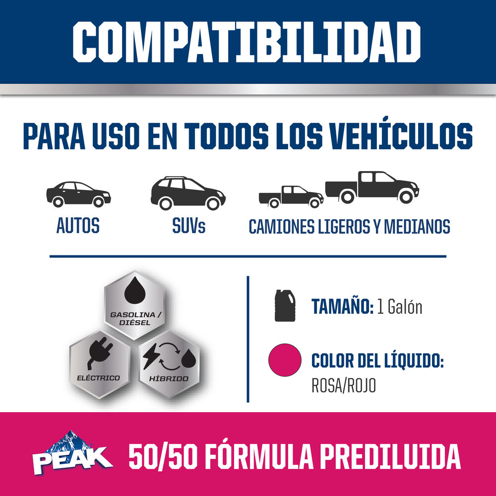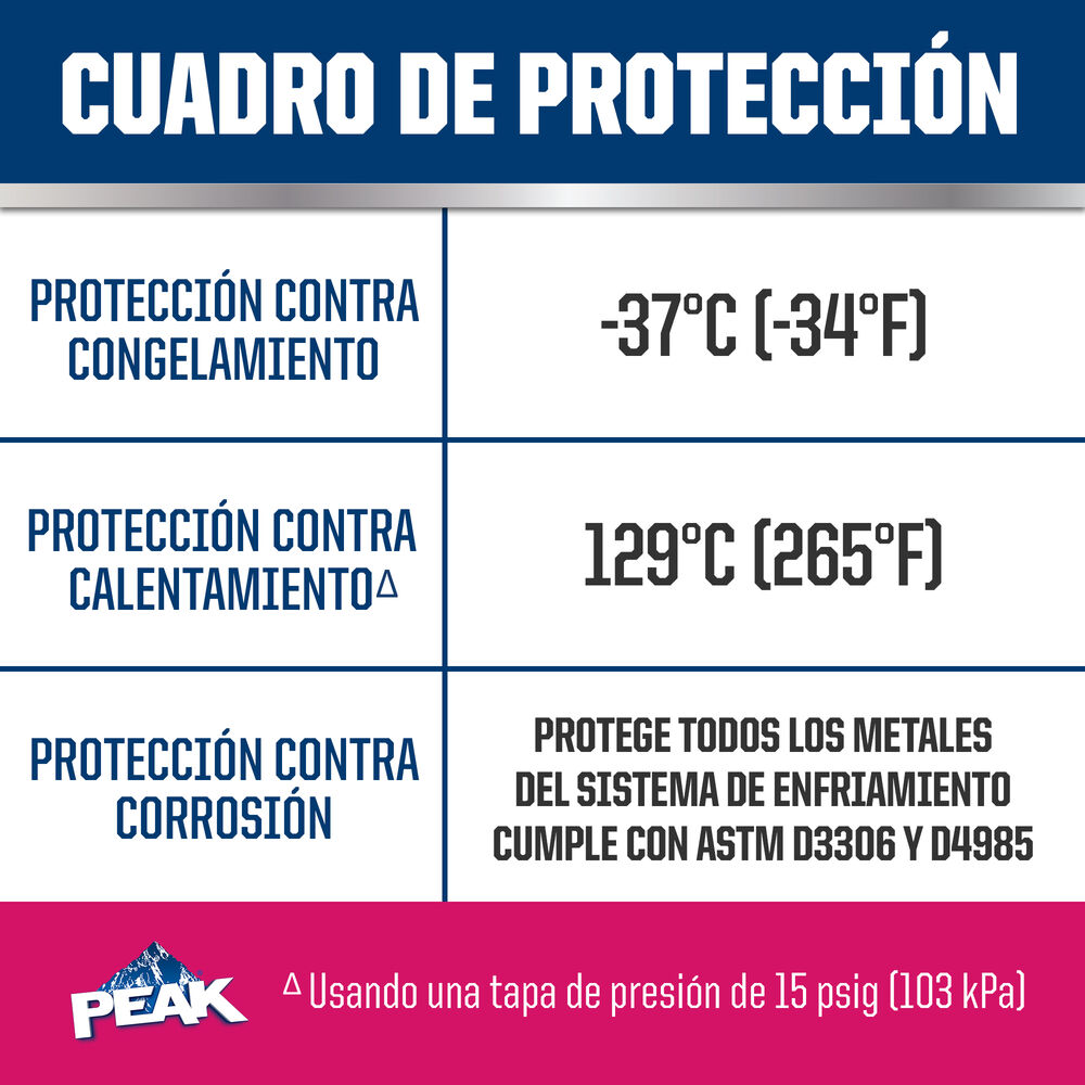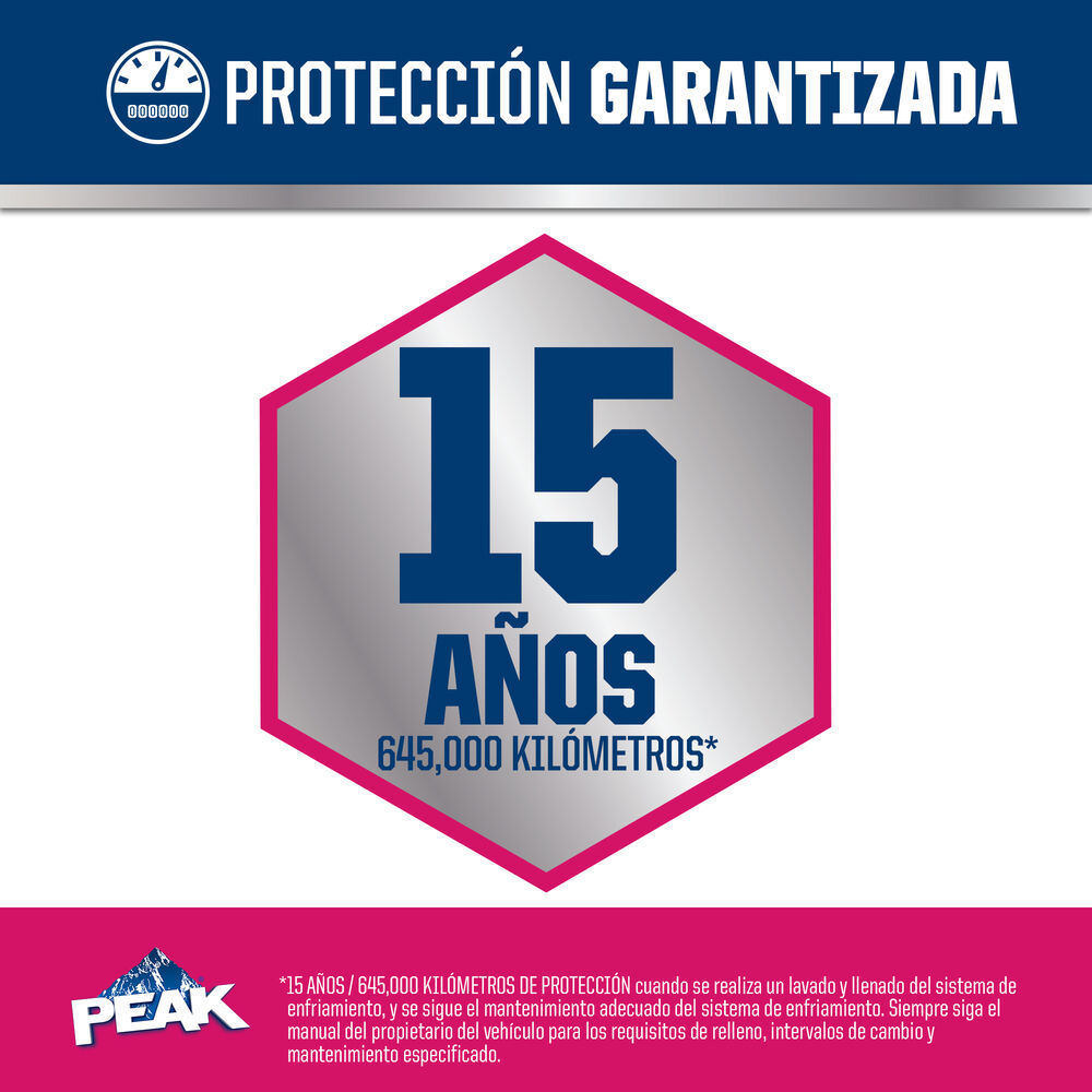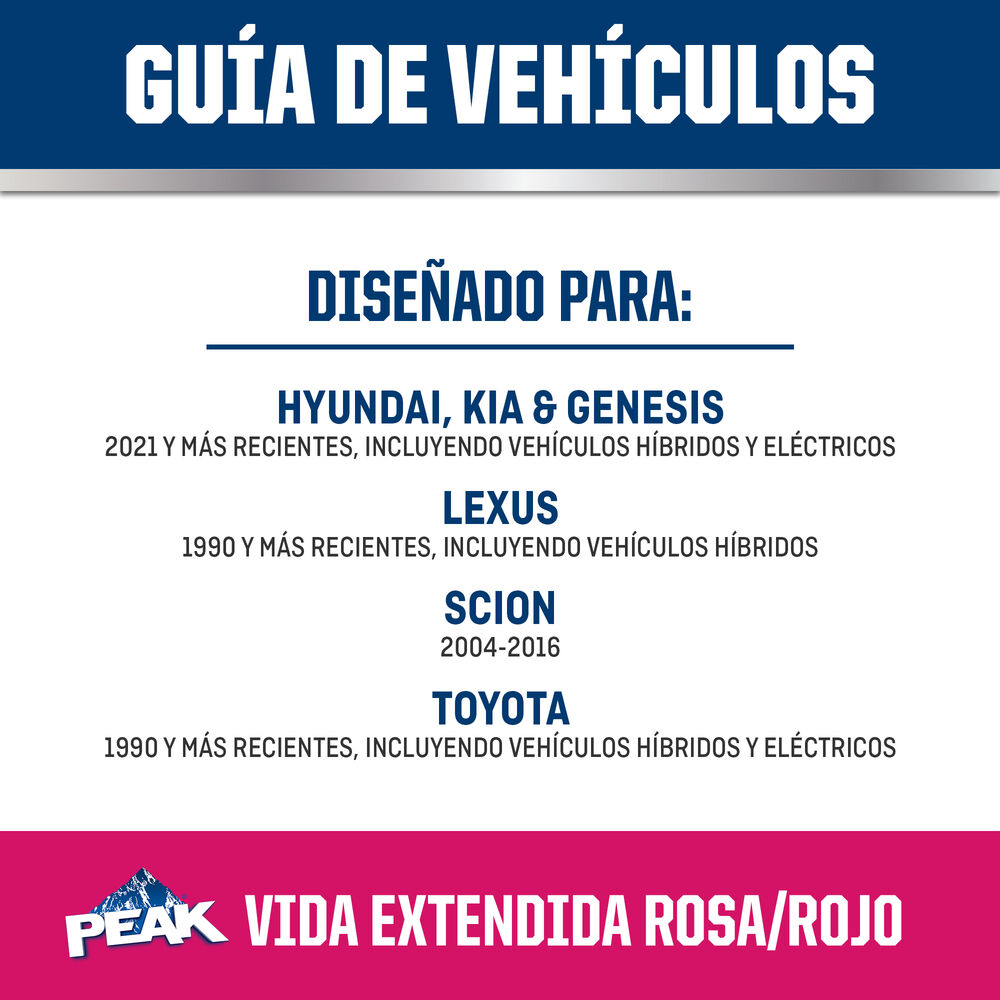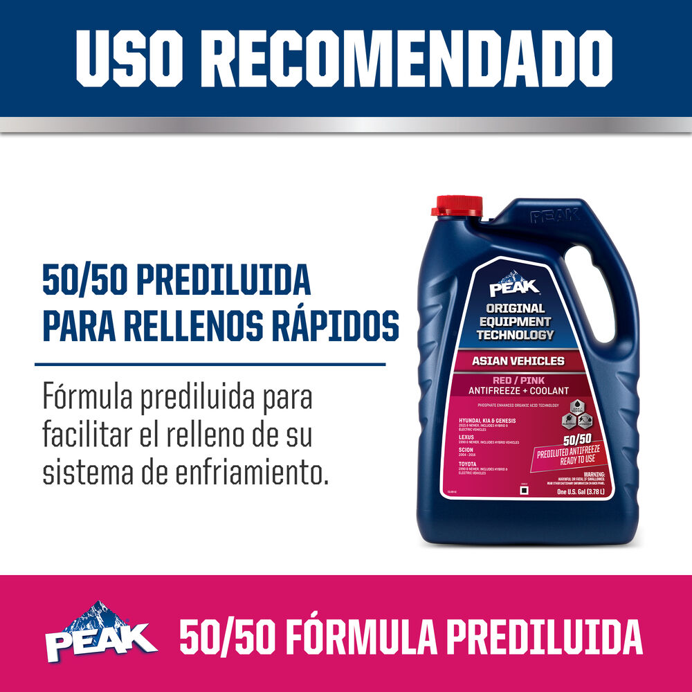 El ANTICONGELANTE + REFRIGERANTE PREDILUIDO 50/50 PEAK ORIGINAL EQUIPMENT TECHNOLOGY para VEHÍCULOS ASIÁTICOS - ROJO/ROSA es un anticongelante/refrigerante a base de etilenglicol desarrollado específicamente para su uso en cualquier vehículo asiático que requiera una formulación rojo o rosa de tecnología de ácido orgánico potenciada con fosfato (phosphate-enhanced organic acid technology, POAT). Contiene inhibidores de corrosión ácida orgánicos de alta calidad y no contiene borato, nitrito, silicato y sustancias químicas aminas. El ANTICONGELANTE + REFRIGERANTE PEAK ORIGINAL EQUIPMENT TECHNOLOGY para VEHÍCULOS ASIÁTICOS - ROJO/ROSA cumple con los requisitos de rendimiento D3306 y JIS K2234 de la ASTM. Con una descarga completa y el llenado de refrigerante, PEAK garantiza que este refrigerante proporcionará una protección de vida útil de hasta 645,000 kilómetros o 15 años. Use el ANTICONGELANTE + REFRIGERANTE PREDILUIDO 50/50 de PEAK ORIGINAL EQUIPMENT TECHNOLOGY cuando llene su sistema.