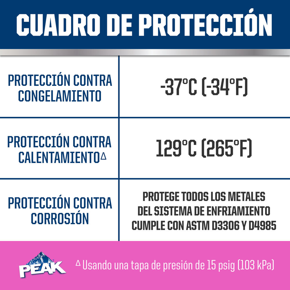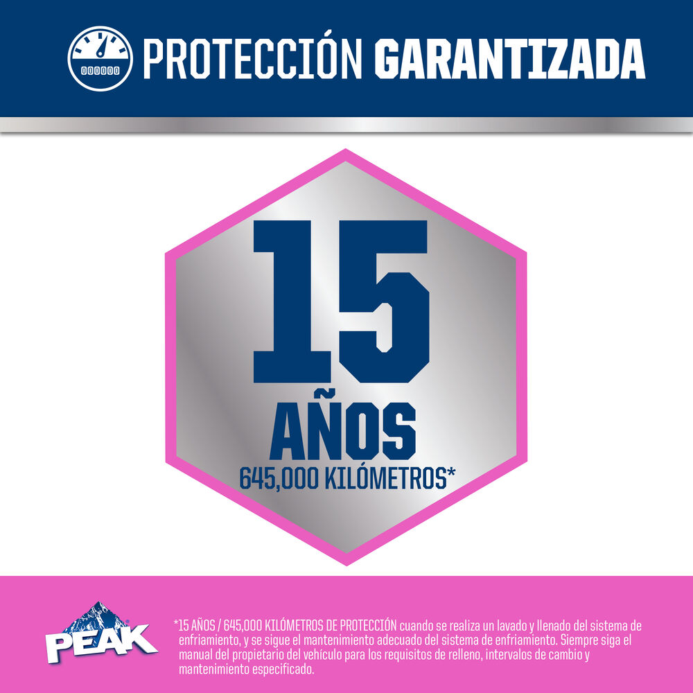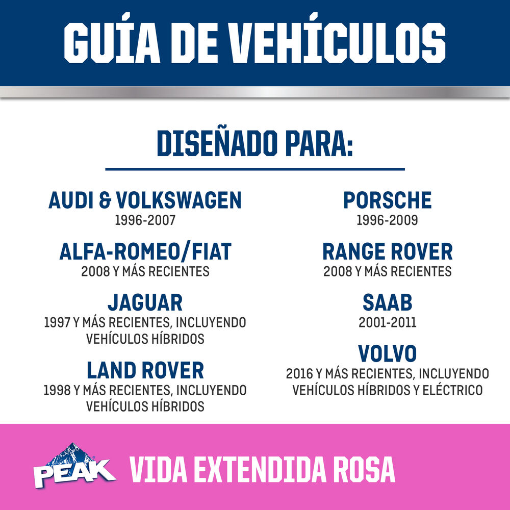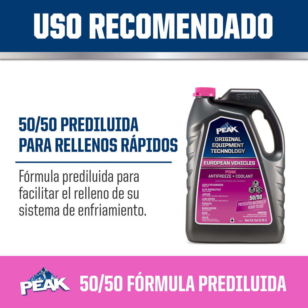 El ANTICONGELANTE + REFRIGERANTE PREDILUIDO 50/50 PEAK ORIGINAL EQUIPMENT TECHNOLOGY para VEHÍCULOS EUROPEOS - ROSA es un anticongelante/refrigerante a base de etilenglicol desarrollado específicamente para su uso en cualquier vehículo europeo que requiera una formulación rosa de tecnología de ácido orgánico (organic acid technology, OAT) libre de silicatos. Contiene inhibidores de corrosión ácida orgánicos de alta calidad y no contiene borato, nitrito, nitrato, fosfato, silicato y sustancias químicas aminas. El ANTICONGELANTE + REFRIGERANTE PEAK ORIGINAL EQUIPMENT TECHNOLOGY para VEHÍCULOS EUROPEOS - ROSA cumple con los requisitos de rendimiento D3306 y BS 6580 de la ASTM. Con una descarga completa y el llenado de refrigerante, PEAK garantiza que este refrigerante proporcionará una protección de vida útil de hasta 645,000 kilómetros o 15 años. Use el ANTICONGELANTE + REFRIGERANTE PREDILUIDO 50/50 de PEAK ORIGINAL EQUIPMENT TECHNOLOGY cuando llene su sistema.