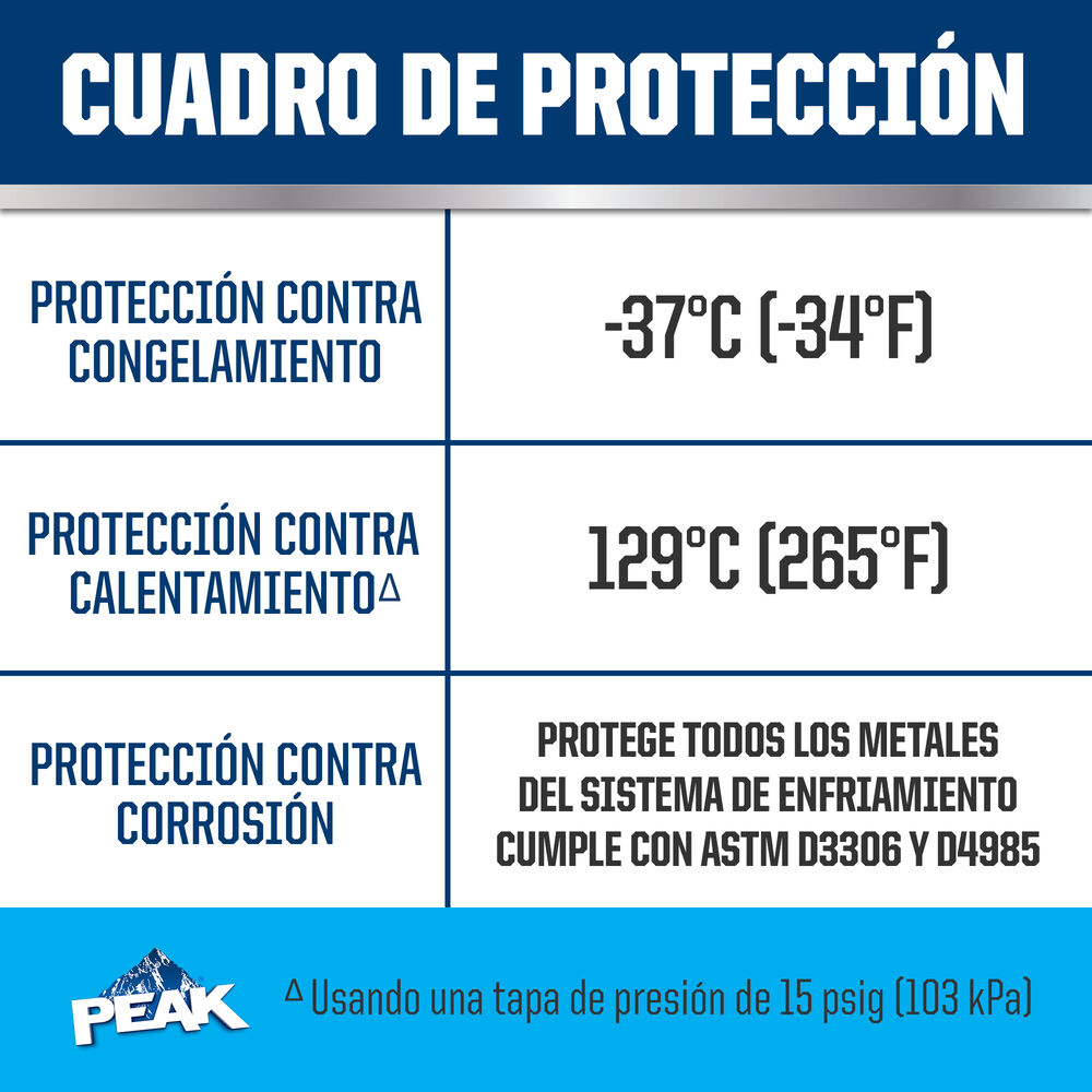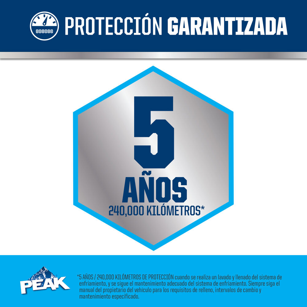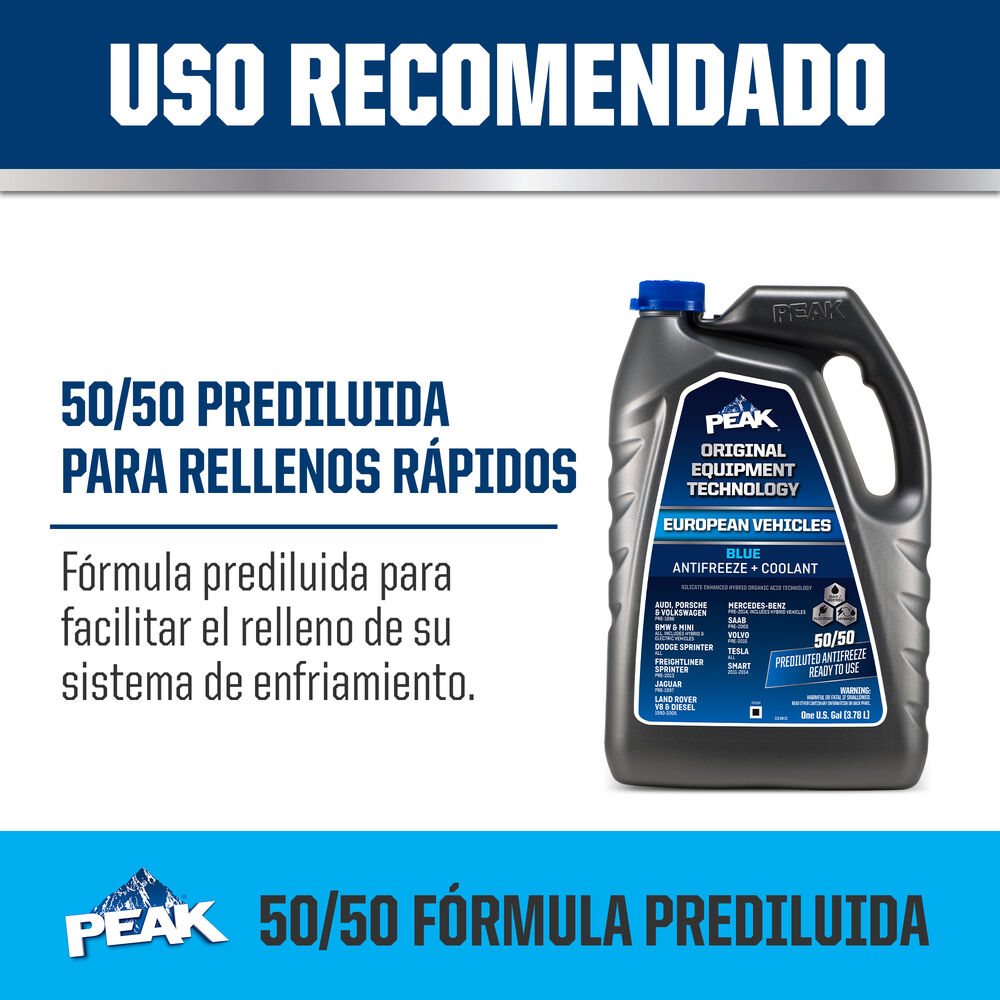 El ANTICONGELANTE + REFRIGERANTE PREDILUIDO PEAK ORIGINAL EQUIPMENT TECHNOLOGY para VEHÍCULOS EUROPEOS AZUL 50/50 es un anticongelante/refrigerante a base de etilenglicol desarrollado específicamente para su uso en cualquier vehículo europeo que requiera una fórmula azul de tecnología de ácido orgánico híbrido potenciada por silicatos (silicate-enhanced hybrid organic acid technology, Si-HOAT). Contiene inhibidores de corrosión orgánicos e inorgánicos de alta calidad y no contiene nitrito, fosfato y sustancias químicas aminas. El ANTICONGELANTE + REFRIGERANTE PEAK ORIGINAL EQUIPMENT TECHNOLOGY™ para VEHÍCULOS EUROPEOS AZUL cumple con los requisitos de rendimiento D3306 y BS 6580 de la ASTM. Con una descarga completa y el llenado de refrigerante, PEAK garantiza que este refrigerante proporcionará una protección de vida útil de hasta 240,000 kilómetros o 5 años. Use el ANTICONGELANTE + REFRIGERANTE PREDILUIDO 50/50 de PEAK ORIGINAL EQUIPMENT TECHNOLOGY™ cuando llene su sistema.