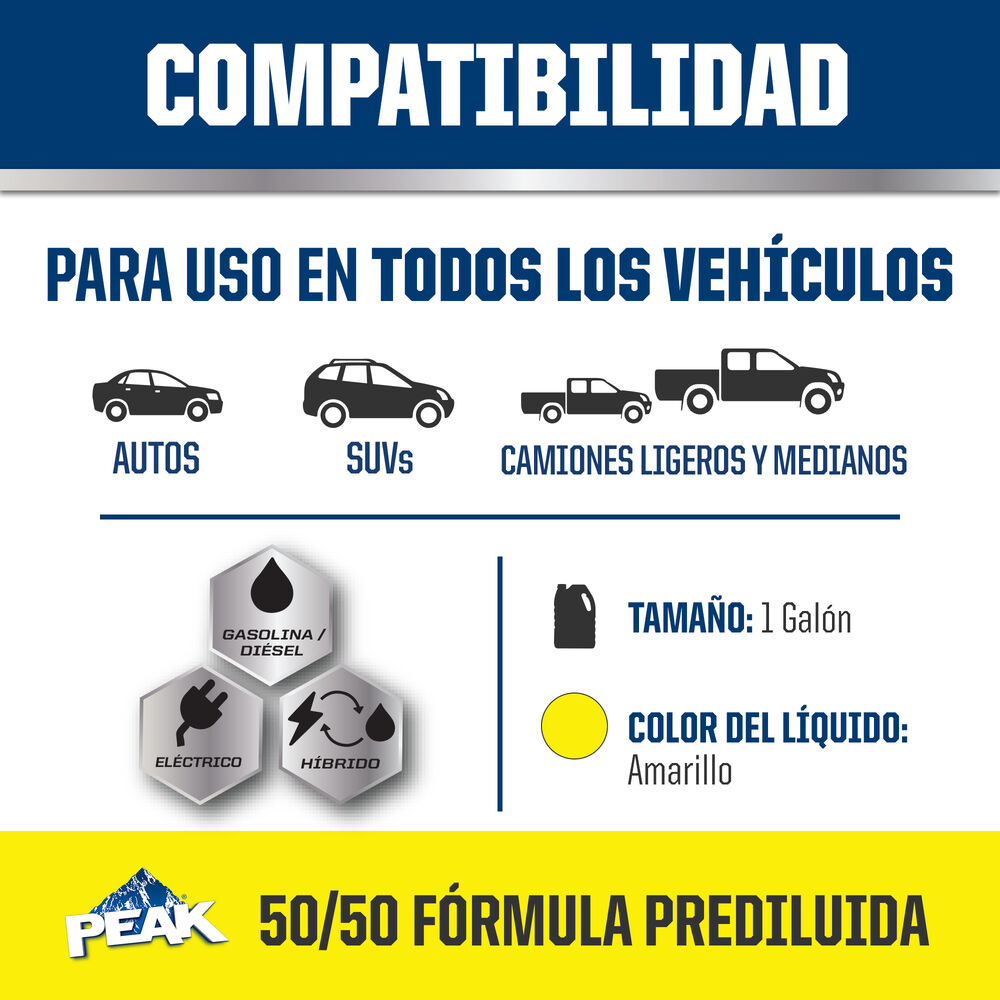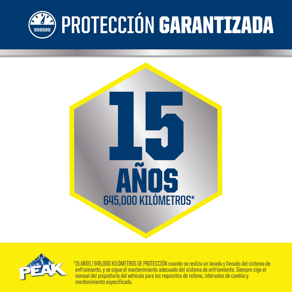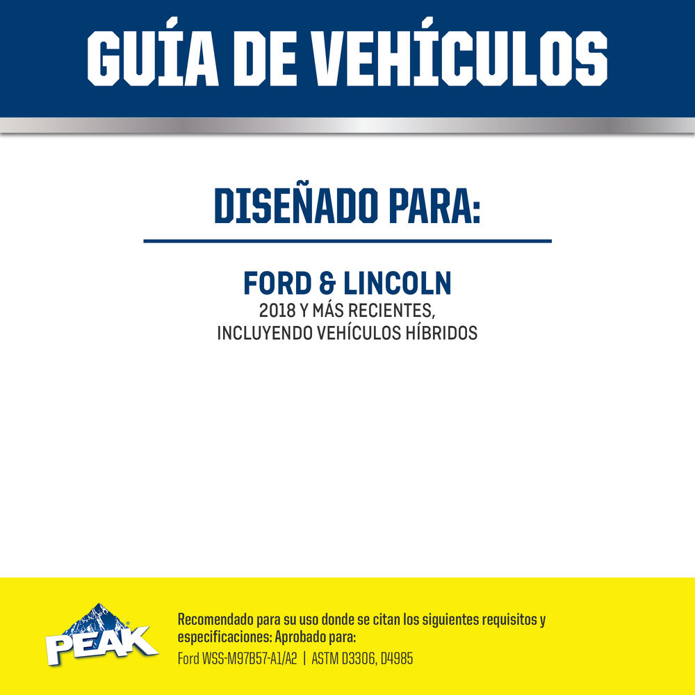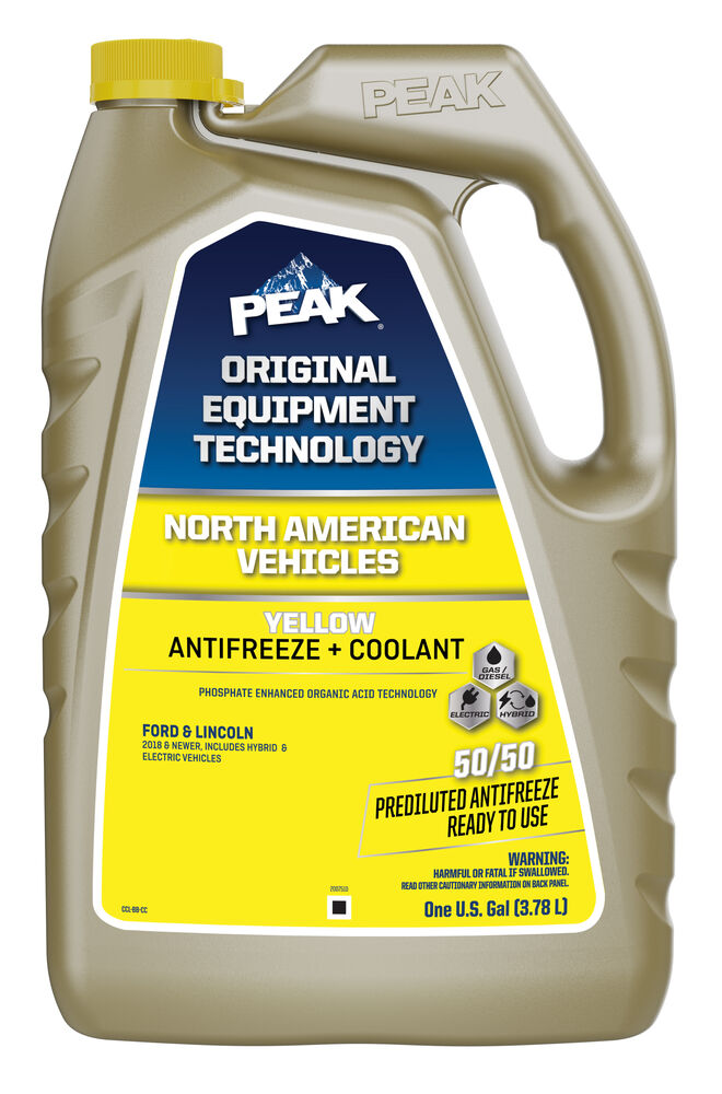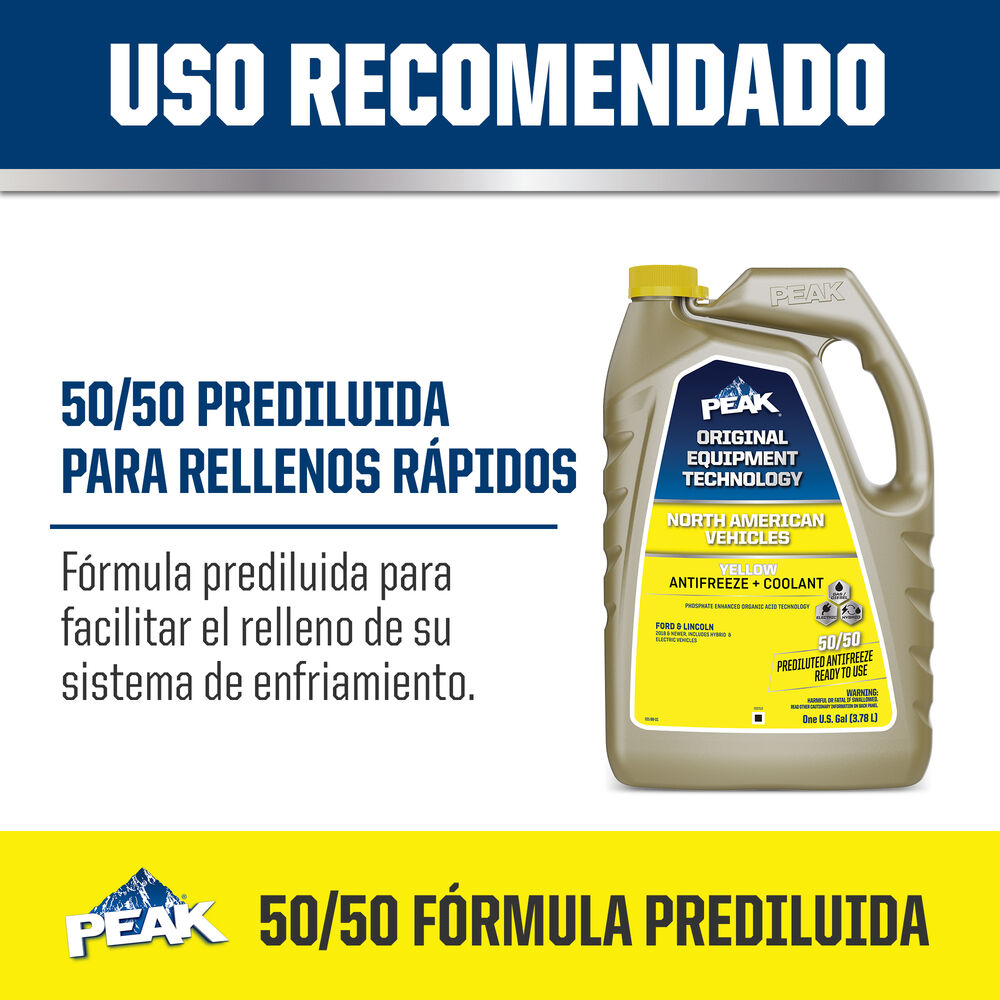 ANTICONGELANTE + REFRIGERANTE PREDILUIDO 50/50 DE PEAK ORIGINAL EQUIPMENT TECHNOLOGY™ PARA VEHÍCULOS NORTEAMERICANOS – AMARILLO es un anticongelante/refrigerante de larga duración basado en la tecnología patentada de ácido orgánico mejorado con fosfato. La fórmula a base de etilenglicol combina una mezcla de inhibidores de corrosión de ácido orgánico, silicato estabilizado y una combinación de nitrito/nitrato para proporcionar una protección completa contra la corrosión a los motores de gasolina y diésel para todos los vehículos Ford y Lincoln de 2019 y posteriores. ANTICONGELANTE + REFRIGERANTE PREDILUIDO 50/50 DE PEAK ORIGINAL EQUIPMENT TECHNOLOGY™ PARA VEHÍCULOS NORTEAMERICANOS – AMARILLO no contiene silicato, borato, fosfato, nitrito ni aminas, y es totalmente compatible con otros refrigerantes de larga duración. Cumple los requisitos de rendimiento de Ford WSS-M97B57-A1, ASTM D3306 y D4985. Cuando se instala como parte de un lavado completo y llenado de refrigerante, PEAK garantiza que este refrigerante proporcionará una protección de vida útil de hasta 645.000 KILÓMETROS o 15 años.