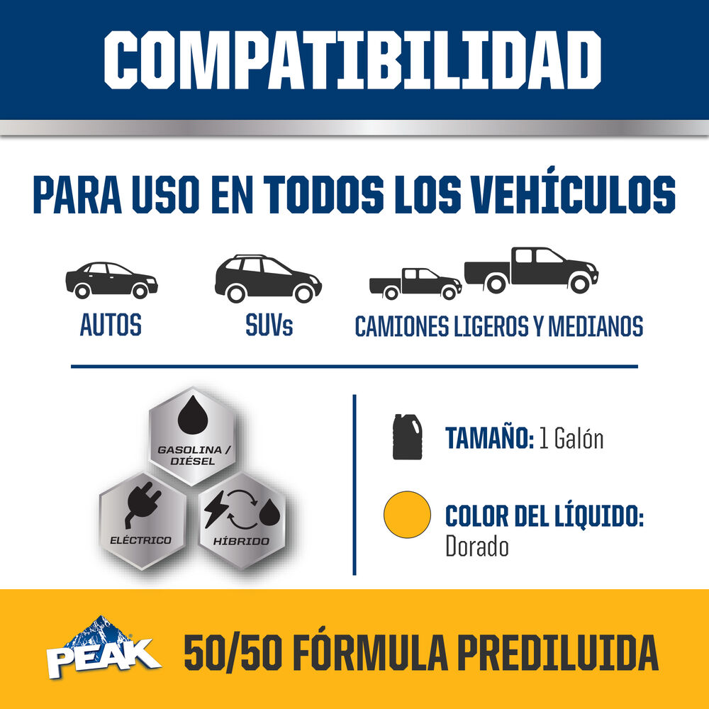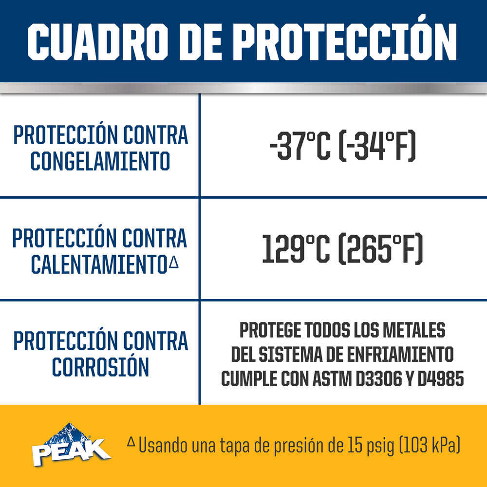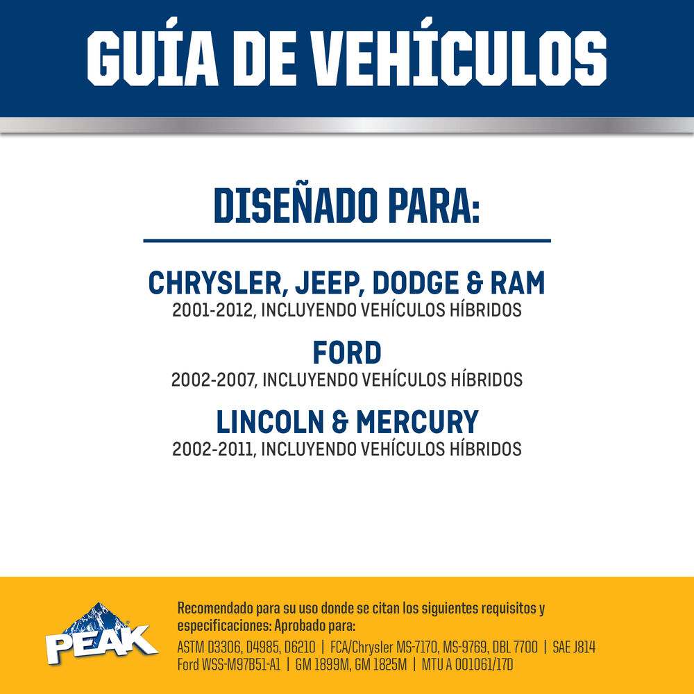 EL ANTICONGELANTE + REFRIGERANTE DE PEAK ORIGINAL EQUIPMENT TECHNOLOGY para VEHÍCULOS NORTEAMERICANOS - DORADO PREDILUIDO 50/50 es un anticongelante/refrigerante de larga duración con tecnología de ácido orgánico híbrido dorado (HOAT) patentada. La fórmula a base de etilenglicol combina una mezcla de inhibidores de corrosión de ácidos orgánicos, silicato estabilizado y una combinación de nitrito/nitrato para brindar una protección completa contra la corrosión a los motores de gasolina y diésel. Su fórmula baja en silicato con aditivos de control de depósitos protege contra la cavitación del revestimiento de manga húmeda y la formación de incrustaciones. El color dorado de este producto distingue su química única y asegura una fácil selección para los vehículos Ford y Chrysler que requieren este tipo de tecnología y color de refrigerante. EL ANTICONGELANTE + REFRIGERANTE PEAK ORIGINAL EQUIPMENT TECHNOLOGY para VEHÍCULOS NORTEAMERICANOS - DORADO no contiene fosfatos, aminas ni ácido 2-etilhexanoico (2-EHA) y es seguro para los componentes no metálicos del sistema de refrigeración. Es totalmente compatible con otros refrigerantes híbridos dorados y cumple con los requisitos de rendimiento D3306, D4985 y D6210 de la ASTM. Con una descarga completa y llenado, PEAK garantiza que este refrigerante proporcionará la vida útil especificada por los OEM que utilizan esta tecnología específica, por lo general hasta 5 años o 240,000 kilómetros. Use el ANTICONGELANTE + REFRIGERANTE PREDILUIDO 50/50 de PEAK ORIGINAL EQUIPMENT TECHNOLOGY cuando llene su sistema.