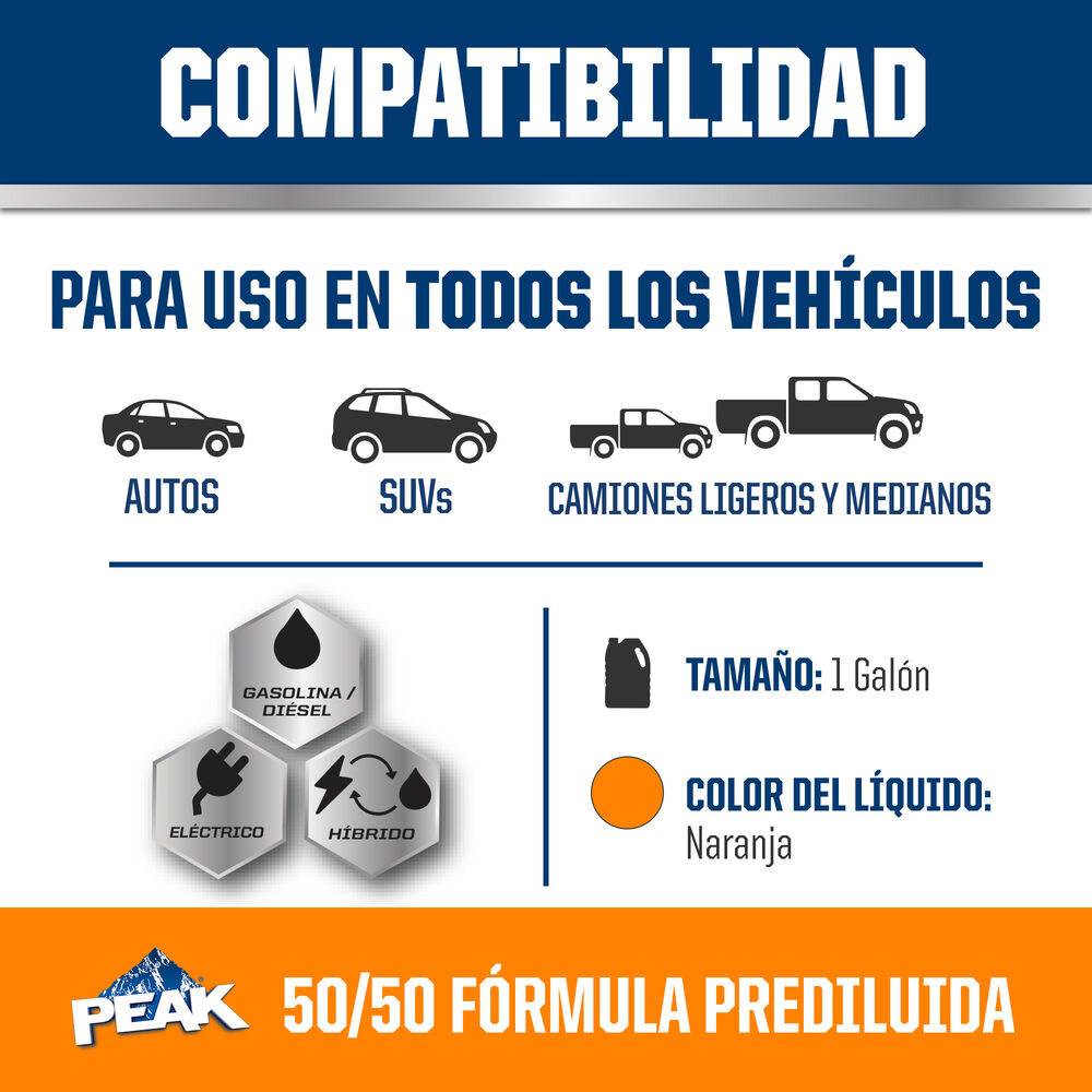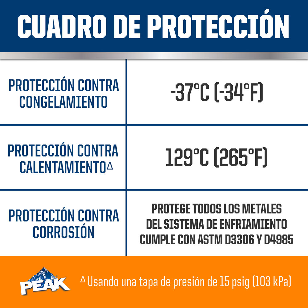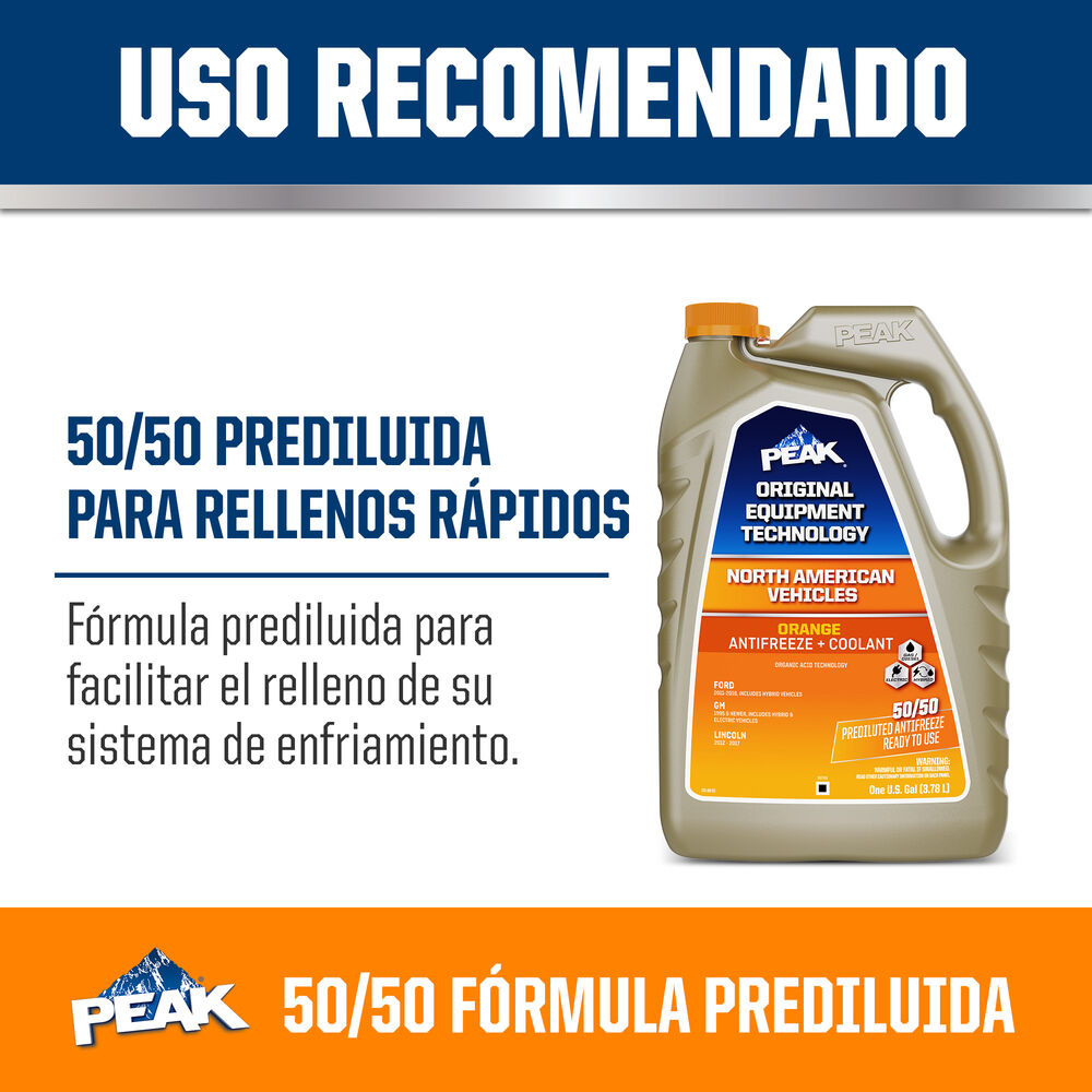 El ANTICONGELANTE + REFRIGERANTE PREDILUIDO 50/50 PEAK ORIGINAL EQUIPMENT TECHNOLOGY para VEHÍCULOS NORTEAMERICANOS - NARANJA es un anticongelante/refrigerante de larga duración con tecnología de punta de ácido orgánico (organic acid technology, OAT) patentada. La fórmula a base de etilenglicol representa una mezcla cuidadosamente equilibrada de inhibidores de corrosión de ácidos orgánicos para una protección completa de los motores modernos de vehículos norteamericanos de alto rendimiento. Puede mezclarse con cualquier formulación aprobada de DEX-COOL® en vehículos GM, Opel, Daewoo y Saab más nuevos, así como con anticongelante/refrigerante en vehículos Ford y Chrysler que requieran un producto de tipo naranja. El color naranja de este producto distingue su química única y asegura una fácil selección para los vehículos norteamericanos que requieren este tipo y color de refrigerante. El ANTICONGELANTE + REFRIGERANTE PEAK ORIGINAL EQUIPMENT TECHNOLOGY para VEHÍCULOS NORTEAMERICANOS - NARANJA no contiene silicato, borato, fosfato, nitrito y sustancias químicas aminas, y es totalmente compatible con otros refrigerantes de larga duración. Cumple con los requisitos de rendimiento D3306 y D4985 de la ASTM. Cuando se instala como parte de una descarga completa y llenado de refrigerante, PEAK garantiza que este refrigerante proporcionará una protección de vida útil de hasta 645,000 kilómetros o 15 años. Use ANTICONGELANTE + REFRIGERANTE PREDILUIDO 50/50 PEAK ORIGINAL EQUIPMENT TECHNOLOGY para realizar una descarga/un llenado completo o una recarga.
