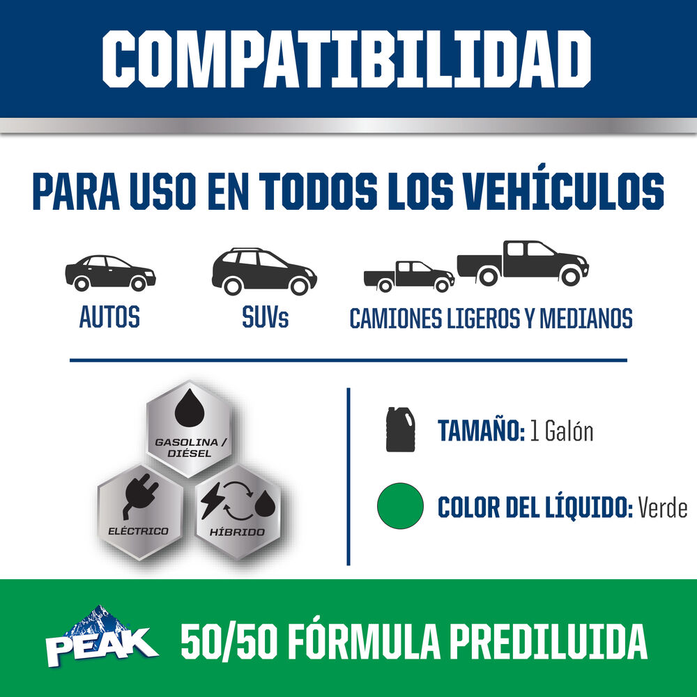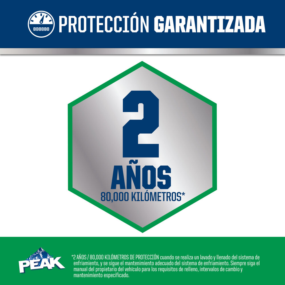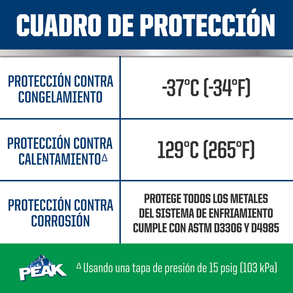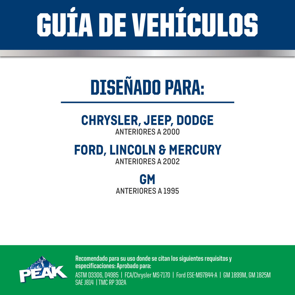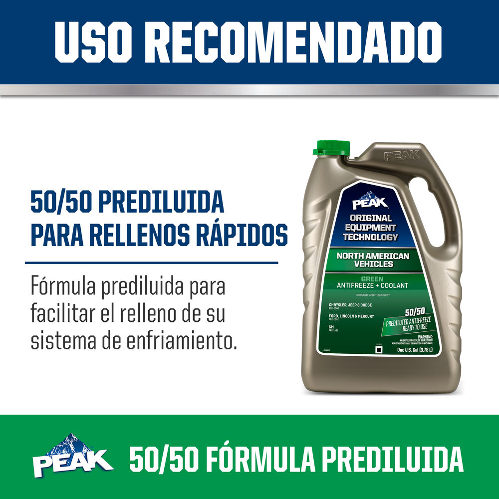 El ANTICONGELANTE + REFRIGERANTE PREDILUIDO 50/50 PEAK ORIGINAL EQUIPMENT TECHNOLOGY para VEHÍCULOS NORTEAMERICANOS - VERDE es un anticongelante/refrigerante premium bajo en silicatos basado en la tecnología de aditivos inorgánicos (inorganic additive technology, IAT) convencional patentada. Su fórmula a base de etilenglicol representa una mezcla cuidadosamente equilibrada de inhibidores de corrosión inorgánica más estabilizador de silicato para la protección completa de motores que requieren una formulación baja en silicatos. No contiene nitritos y sustancias químicas aminas y es compatible con componentes de sistemas de refrigeración no metálicos. El color verde de este producto distingue su composición química única y asegura una fácil selección para los vehículos norteamericanos que requieren este tipo de tecnología y color de refrigerante. El ANTICONGELANTE + REFRIGERANTE PEAK ORIGINAL EQUIPMENT TECHNOLOGY para VEHÍCULOS NORTEAMERICANOS - VERDE es totalmente compatible con otros refrigerantes convencionales verdes y cumple con los requisitos de rendimiento D3306 y D4985 de la ASTM. Con una descarga completa y llenado, PEAK garantiza que este refrigerante proporcionará la vida útil especificada por los OEM que utilizan esta tecnología específica, por lo general hasta 2 años o 80,000 kilómetros. Use el ANTICONGELANTE + REFRIGERANTE PREDILUIDO 50/50 de PEAK ORIGINAL EQUIPMENT TECHNOLOGY cuando llene su sistema.
