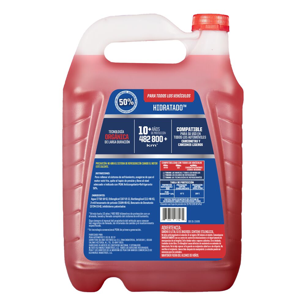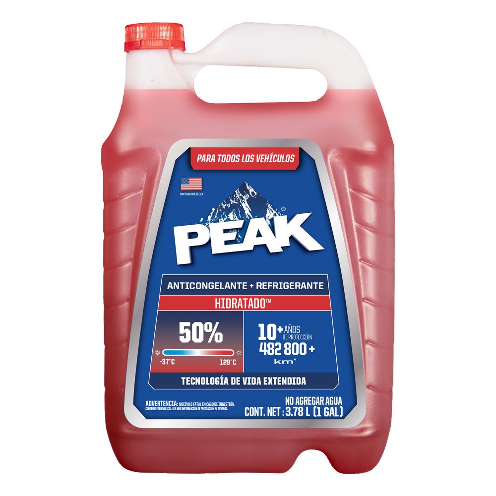 PEAK® Hidratado™ 50% Anticongelante + Refrigerante cuenta con una tecnología de refrigerante de larga duración y de vida extendida que es compatible para su uso en todos los automóviles, camiones de carga ligera y motocicletas, independientemente de la marca, modelo, año o el color de anticongelante original. Sus inhibidores de tecnología orgánica proporcionan la máxima protección del sistema de enfria-miento contra el óxido dañino y la corrosión.